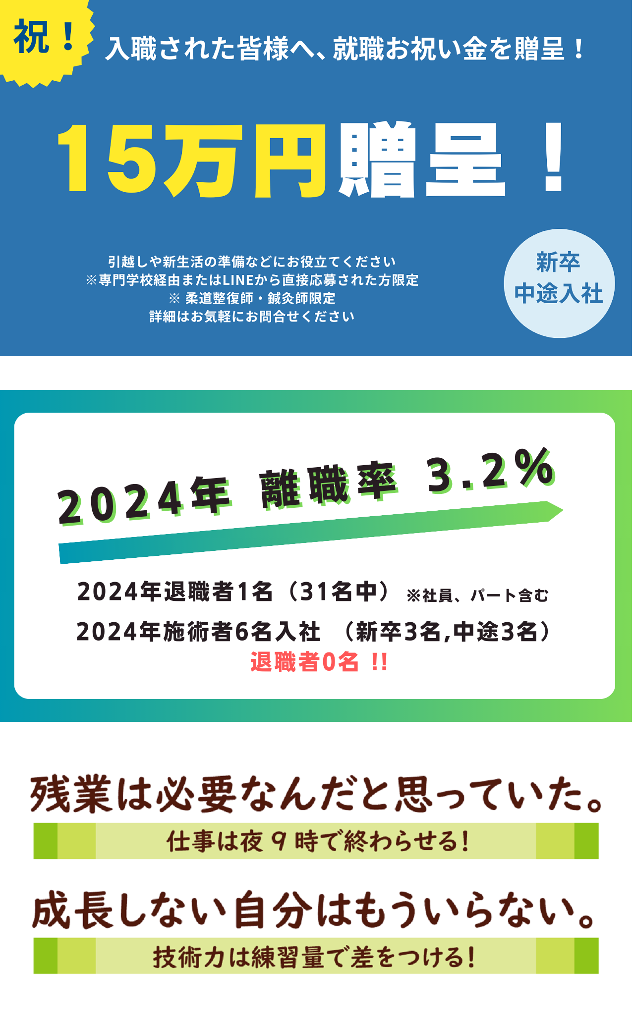 入職された皆さまへ就職お祝い金15万円を贈呈しています。引越しや新生活の準備などにお役立てください。詳細はお気軽にお問い合わせください。 ※ 新卒・中途入社対象 ※ 専門学校経由またはLINEから直接応募された方限定 |